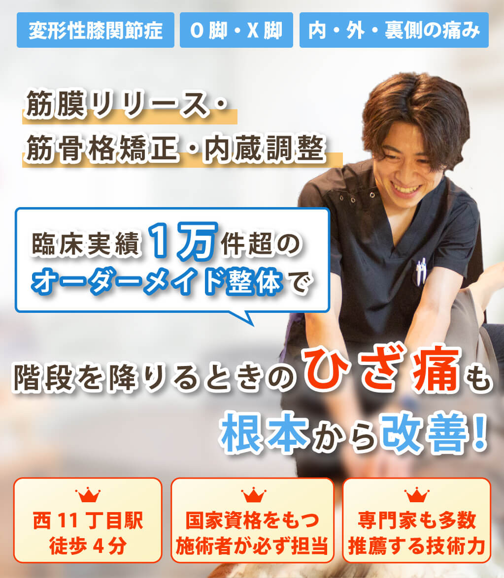 変形性膝関節症、半月板損傷、膝軟骨のすり減り、膝に水が溜まるなど膝の痛みの施術経験が豊富な整体院です。施術して終わりではなく、その後の自宅でできるセルフストレッチや生活習慣の指導もいたします。